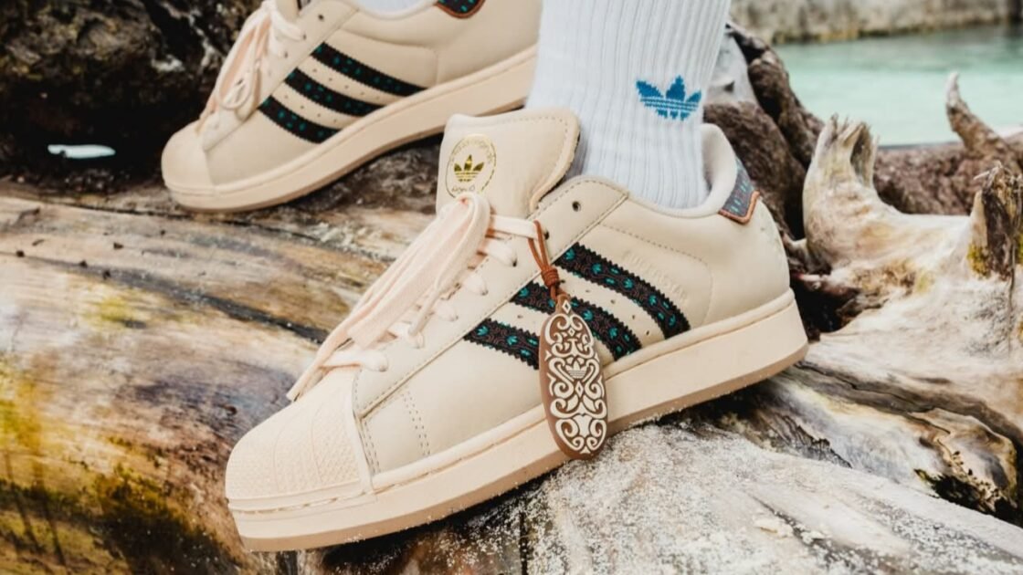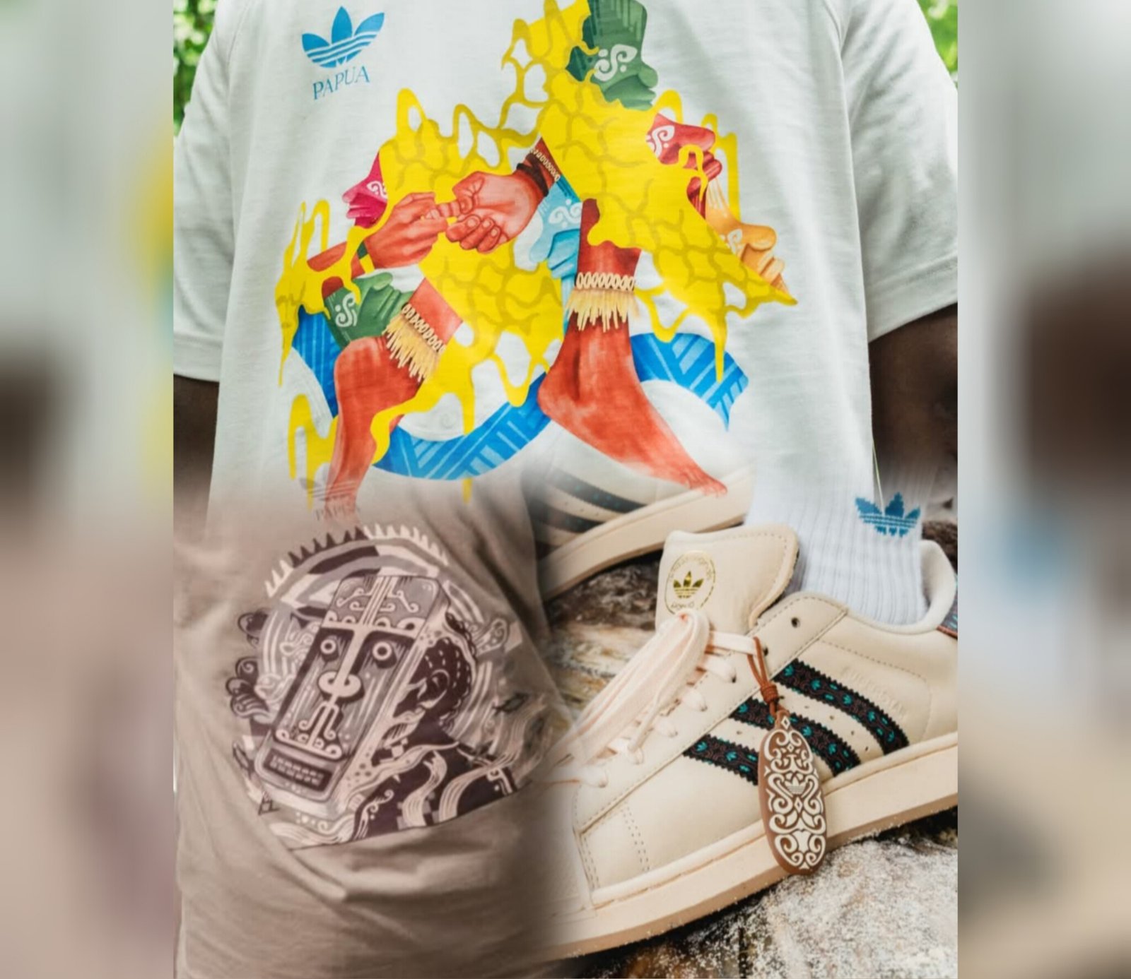 “Memperkenalkan sentuhan baru pada adidas Superstar dengan nuansa khas Papua: menampilkan lambang burung Cendrawasih dan tiga garis (three stripes) yang terinspirasi dari pola ukiran suku Asmat.