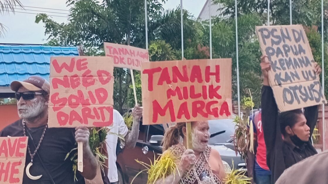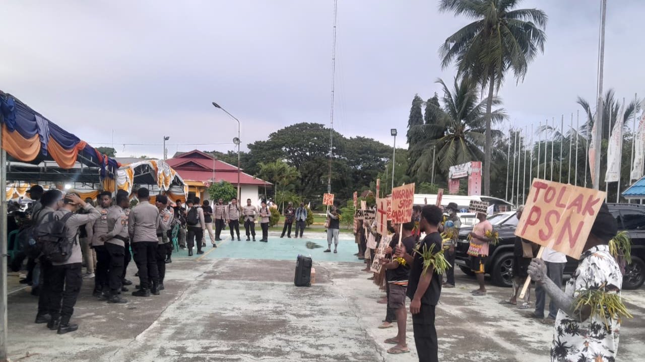 Massa yang terdiri dari masyarakat adat Distrik Ngguti dan Kaptel, bersama para aktivis serta mahasiswa, hadir membawa kegelisahan atas implementasi Proyek Strategis Nasional (PSN) di wilayah mereka.