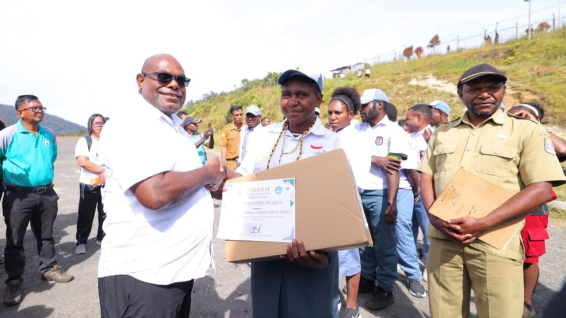Tepat pukul 09.10 WIT, penantian mereka terjawab saat pesawat yang membawa Penjabat Gubernur Papua Tengah, Meki Nawipa, dan Wakil Gubernur Deinas Geley mendarat membawa “buah tangan” yang bukan sekadar barang elektronik, melainkan sebuah janji yang ditepati.