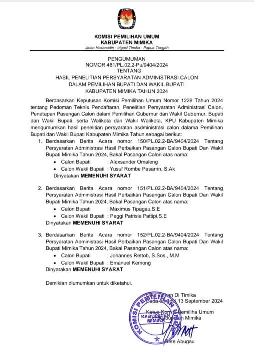 Dalam surat tersebut KPU menjelaskan, Berdasarkan Keputusan Komisi Pemilihan Umum Nomor 1229 Tahun 2024 tentang Pedoman Teknis Pendaftaran, Penelitian Persyaratan Administrasi Calon, Penetapan Pasangan Calon dalam Pemilihan Gubernur dan Wakil Gubernur, Bupati dan Wakil Bupati, serta Walikota dan Wakil Walikota KPU Kabupaten Mimika mengumumkan hasil penelitian persyaratan administrasi calon dalam Pemilihan Bupati dan Wakil Bupati Kabupaten Mimika Tahun sebagai berikut: