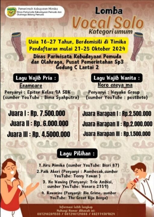 Bidang Pemuda Disparbudpora Mimika Buka Pendaftaran Lomba Vocal Solo Lagu Daerah Papua, Ayo Segera Daftarkan Dirimu, Hadiah Puluhan Juta !