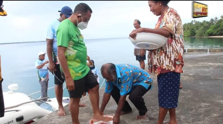 Momen ketika Mendiang Yance Rumbino menyambut kedatangan Kakanwil Provinsi Papua, Antonius M. Ayorbaba bersama tim dengan adat biak (Mansorandak). Foto: Capture YouTube Humas Kemenkumham