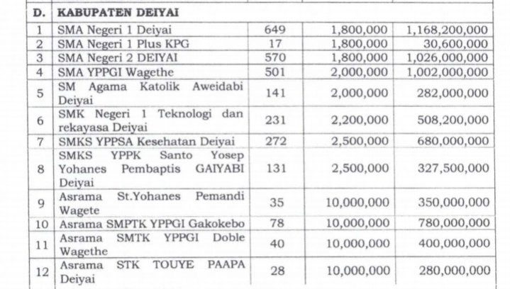 Dana besar tersebut disalurkan secara khusus untuk enam sekolah tingkat SMA/SMK hingga sekolah berpola asrama guna menjamin keberlangsungan pendidikan bagi 2.693 anak di Kabupaten Deiyai.