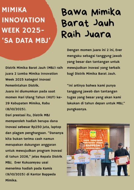 Distrik Mimika Barat Jauh (MBJ) raih juara 2 Lomba Mimika Innovation Week 2025 kategori Inovasi Pemerintahan Distrik.