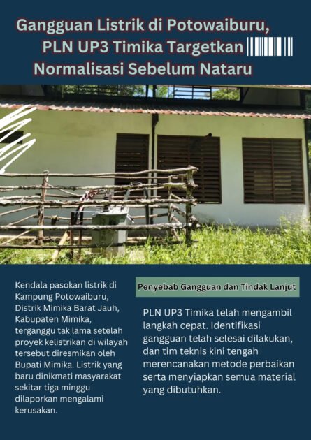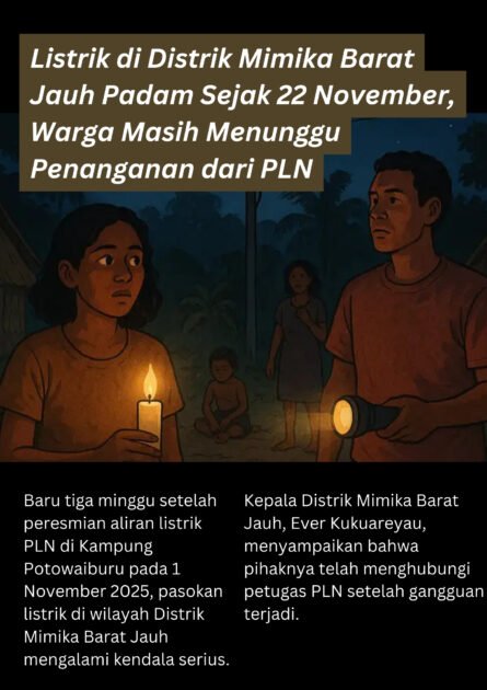Baru tiga minggu setelah peresmian aliran listrik PLN di Kampung Potowaiburu pada 1 November 2025, pasokan listrik di wilayah Distrik Mimika Barat Jauh mengalami kendala serius.