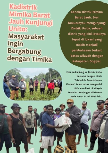 Kepala Distrik Mimika Barat Jauh, Ever Kukuareyau mengunjungi Distrik Unito, sebuah distrik yang kini letaknya tepat di lokasi yang masih menjadi pembahasan terkait batas wilayah dengan Kabupaten Dogiyai.