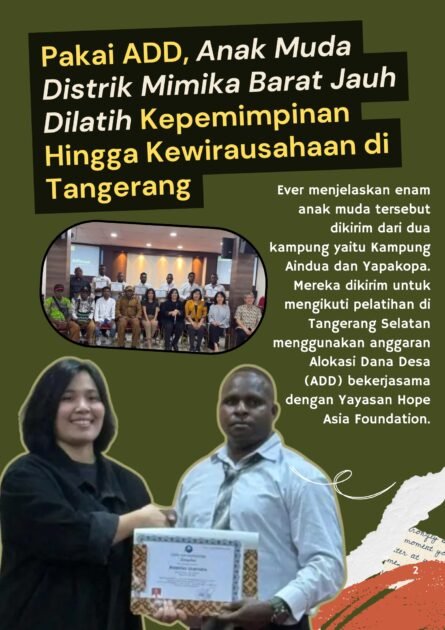 Enam anak muda dari dua kampung yang ada di Distrik Mimika Barat Jauh Dikirim ke Tangerang Selatan untuk mengikuti pelatihan kepemimpinan hingga kewirausahaan.