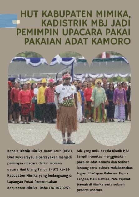 Kepala Distrik Mimika Barat Jauh (MBJ), Ever Kukuareyau dipercayakan menjadi pemimpin upacara dalam momen upacara Hari Ulang Tahun (HUT) ke-29 Kabupaten Mimika yang berlangsung di Lapangan Pusat Pemerintahan Kabupaten Mimika, Rabu (8/10/2025).