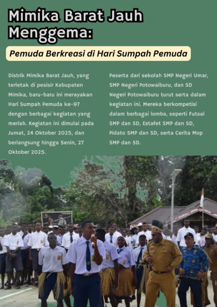Distrik Mimika Barat Jauh, yang terletak di pesisir Kabupaten Mimika, baru-baru ini merayakan Hari Sumpah Pemuda ke-97 dengan berbagai kegiatan yang meriah. Kegiatan ini dimulai pada Jumat, 24 Oktober 2025, dan berlangsung hingga Senin, 27 Oktober 2025.