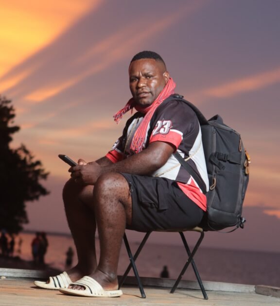 SASAGUPAPUA.COM, Nabire – Semburat jingga mulai membasuh langit Pantai Nabire saat jam menunjukkan pukul 17.00 WIT. Di tengah deru ombak dan riuh warga yang mencari angin sore, seorang pemuda menggunakan baju persipura tampak sibuk menata peralatan.