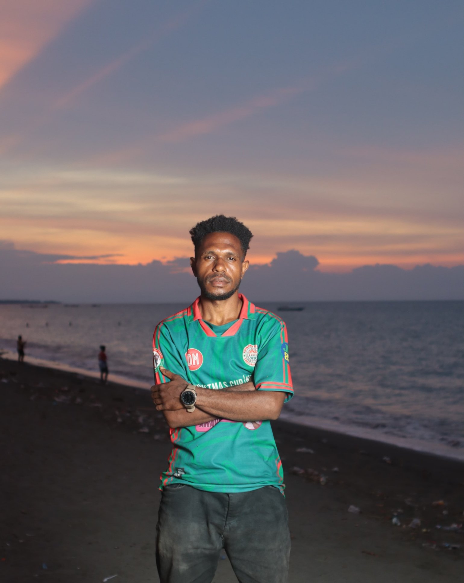 SASAGUPAPUA.COM, Nabire – Semburat jingga mulai membasuh langit Pantai Nabire saat jam menunjukkan pukul 17.00 WIT. Di tengah deru ombak dan riuh warga yang mencari angin sore, seorang pemuda menggunakan baju persipura tampak sibuk menata peralatan.