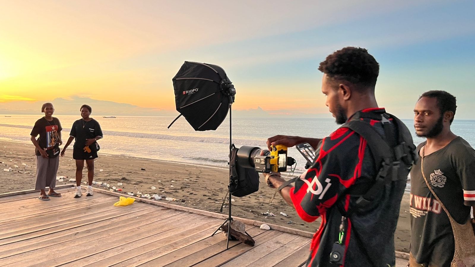 Bukan jaring atau pancing yang ia bawa, melainkan kamera mirrorless, lensa bongsor, dan tiang lampu flash yang berdiri tegak menantang redupnya cahaya matahari.