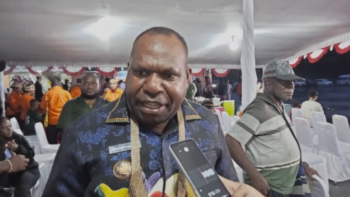 Bupati Intan Jaya, Aner Maisini saat diwawancarai usai kegiatan pembukaan FBP di Bandara Lama Nabire, Rabu (3/9/2025). Foto: Kristin Rejang/Sasagupapua.com.