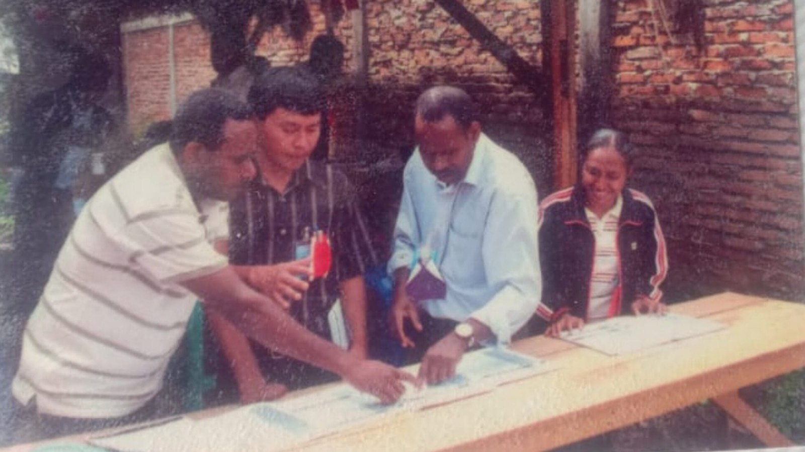 Ferdinand saat bekerja sebagai Field Supervisor Biro Ekonomi Suku Damal bertugas mendampingi kelompok usaha penerima dana pengembangan ekonomi. Melakukan berbagai pelatihan manajemen usaha, Pendampingan Intensif perkembangan kelompok usaha. Foto: Istimewa