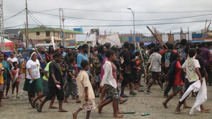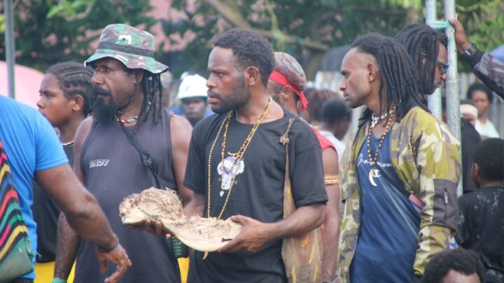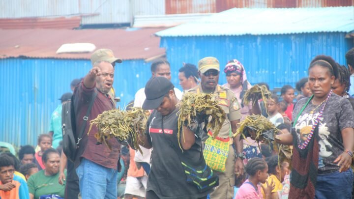 PARA penari perang-perangan yang telah menampilkan tariannya pada tanggal 26 Juni 2024 dalam momen pembukaan Festival Budaya Amungme Kamoro yang digelar oleh Dinas Pariwisata, Kebudayaan, Pemuda dan Olahraga (Disparbudpora) lalu, ikut dalam acara penutupan festival tersebut dengan bakar batu pada Senin (1/7/2024) di Eks Pasar Swadaya, Timika, Papua Tengah.