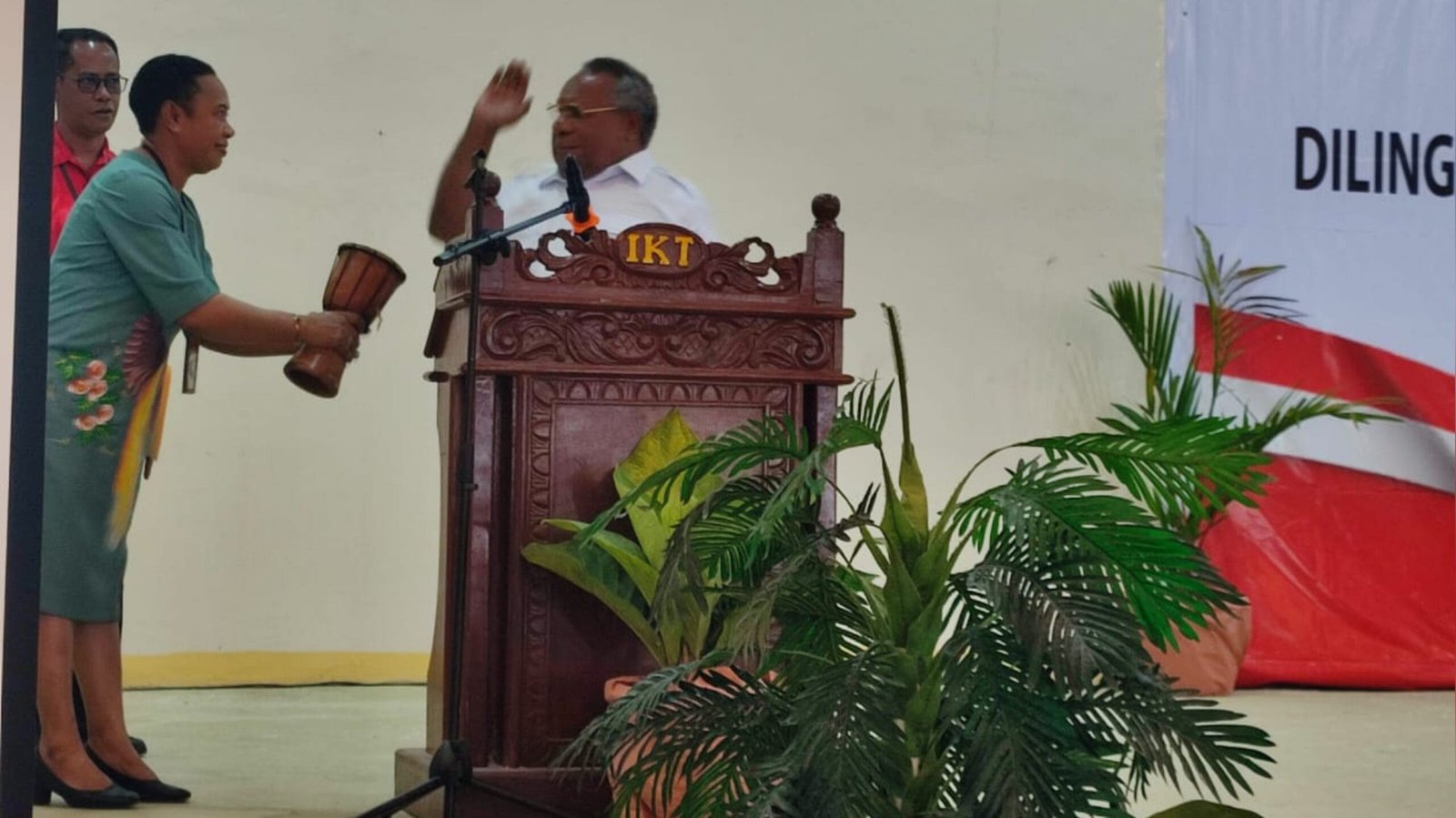 4. Bupati Kabupaten Mimika, Eltinus Omaleng saat membuka acara ditandai pemukulan tifa.
