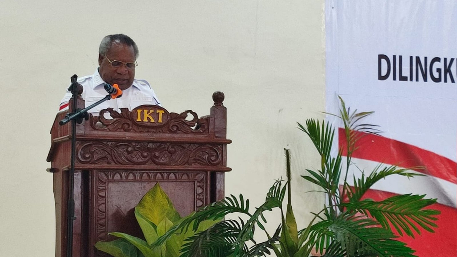 3. Bupati Kabupaten Mimika, Eltinus Omaleng saat membawakan sambutan.