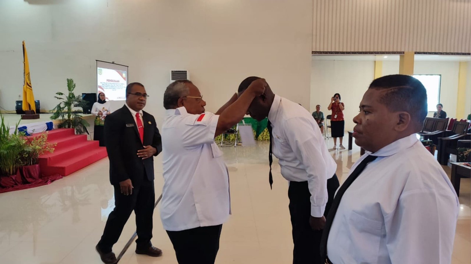 2. Bupati Mimika, Eltinus Omaleng saat menyematkan tanda peserta didampingi Kepala BPKSDM Kabupaten Mimika,Ananias Faot.