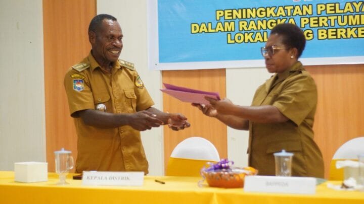 Penyerahan Berita Acara ditandai kepala distrik Iwaka, Linus Dolame.