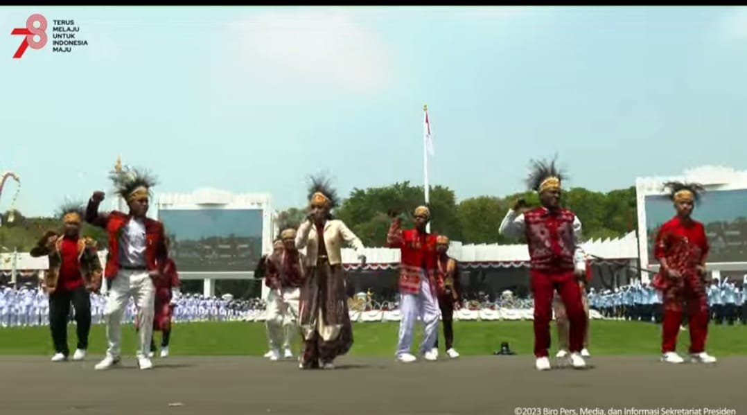 DUA Grup musik hip hop anak muda Papua membuat para tamu di istana negara bergoyang usai pelaksanan upacara bendera merah putih peringati Hari Ulang Tahun (HUT) Republik Indonesia, Kamis (17/8/2023).
