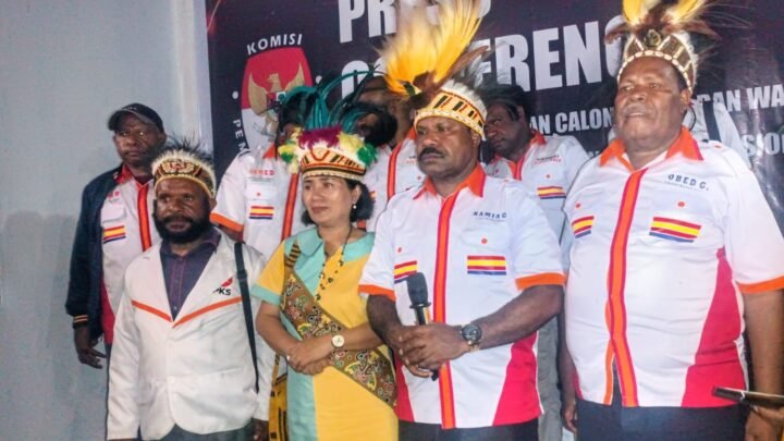 Paslon Namia-Obed bersama tim pemenangan usai memberikan keterangan Pers pada akhir pendaftaran Paslon Bupati dan Wabup Kabupaten Nduga.(Foto: Edwin Rumanasen)
