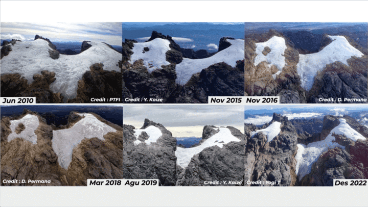 Dalam monitoring tersebut, mereka mendapatkan hasil terjadi penurunan signifikan baik luasan maupun ketebalan es ‘salju abadi’ yang ada di Puncak Sudirman.