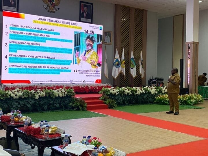 Gubernur Meki Nawipa saat melakukan pemaparan dalam Rapat Kerja Pemerintah Daerah se-Papua Raya bersama BP3OKP, yang berlangsung di Ballroom Kantor Gubernur Papua Tengah, Bandara Lama, pada Senin (15 April 2025). (Dok. Nabirenews.com)