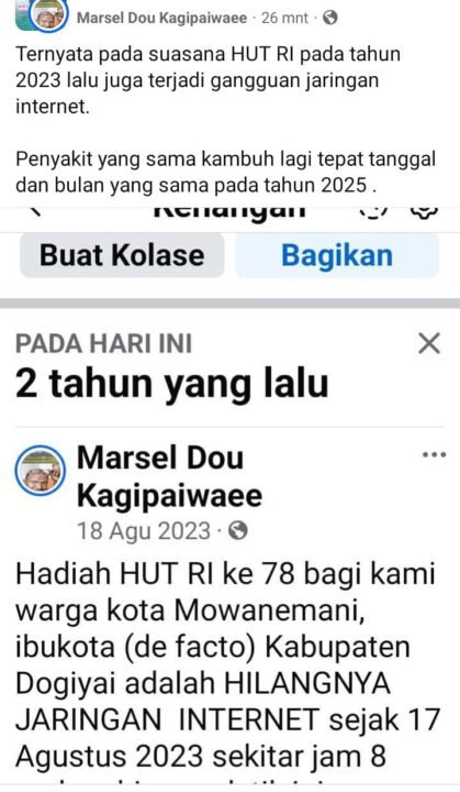 Pada Senin (18/8/2025) malam, salah satu pengguna akun Facebook Marsel Dou Kagipaiwaee membagikan sebuah kenangan di Facebooknya yang menjelaskan kondisi jaringan yang sama terjadi gangguan pada Bulan Agustus Tahun 2023.