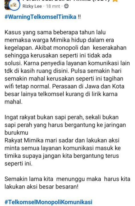 “Ingat rakyat bukan sapi perah, sekali bukan sapi perah yang harus bergantung ke jaringan burukmu. Rakyat Mimika mari sadar dan lakukan aksi minta semua layanan komunikasi masuk ke timika supaya jangan kita bergantung terus seperti ini,” ucapnya.