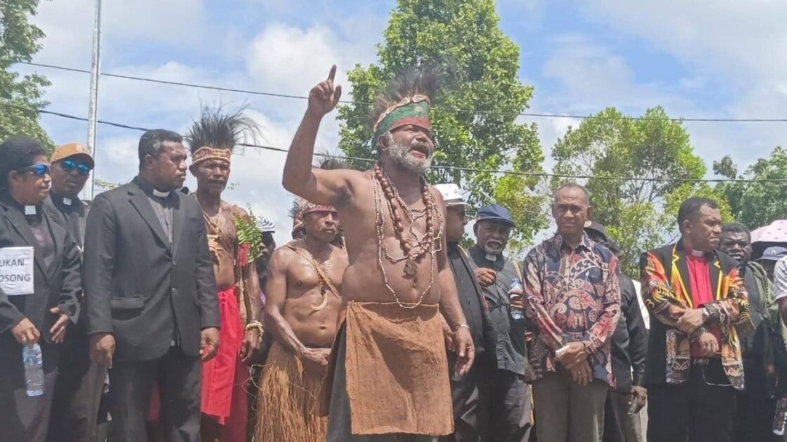 “Dahulu kami kafir, sekarang kami terang. Tapi kami berdoa sampai habis, tanah habis, hutan kami habis, anak cucu kami, istri kami dibantai,” seru Apolos dengan suara parau di hadapan massa.