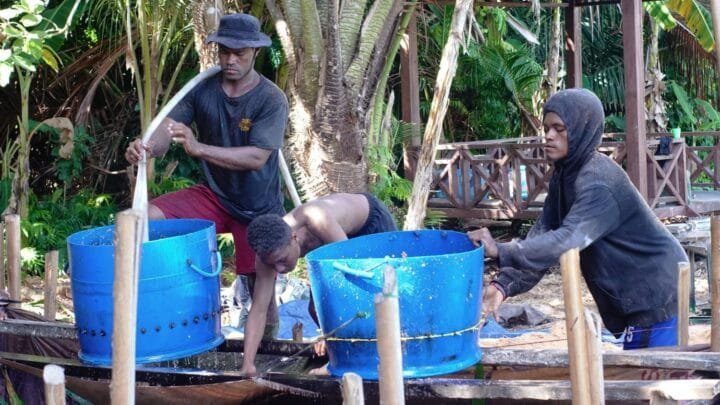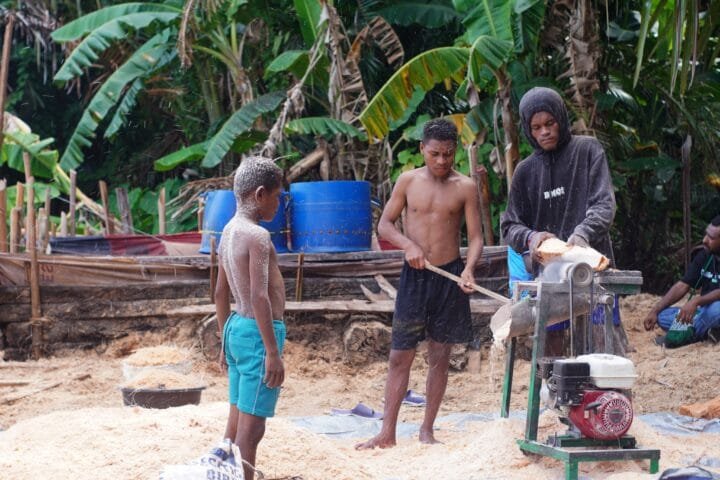 Tampak proses penyaringan sagu yang membutuhkan banyak tenaga. (Foto: Kristin Rejang/Sasagupapua.com)
