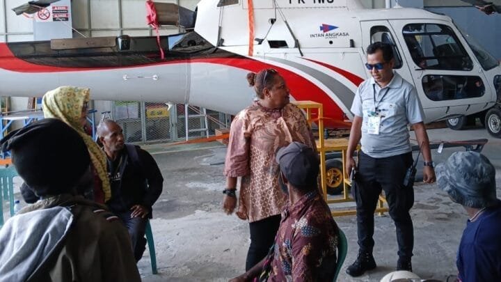 Momen Ketua KPU Papua Tengah, Jenifer Darling Tabuni berkoordinasi di Hanggar Bandara Mozes Kilangin Sisi Selatan Timika.