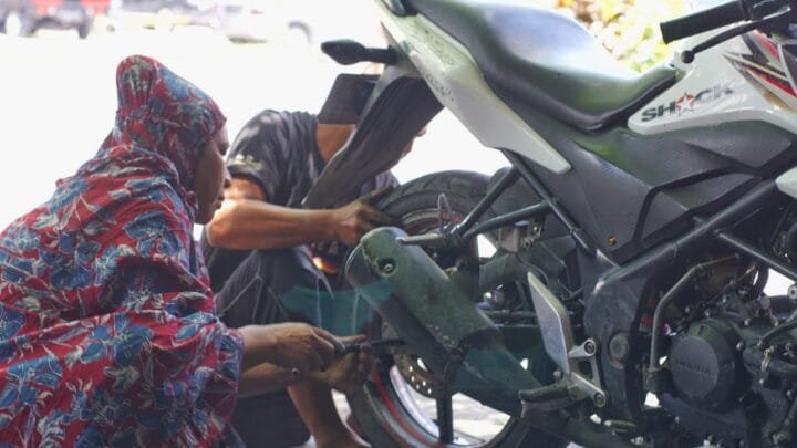 Tampak beberapa motor berjejer dan sedang diperbaiki oleh dua orang montir laki-laki.