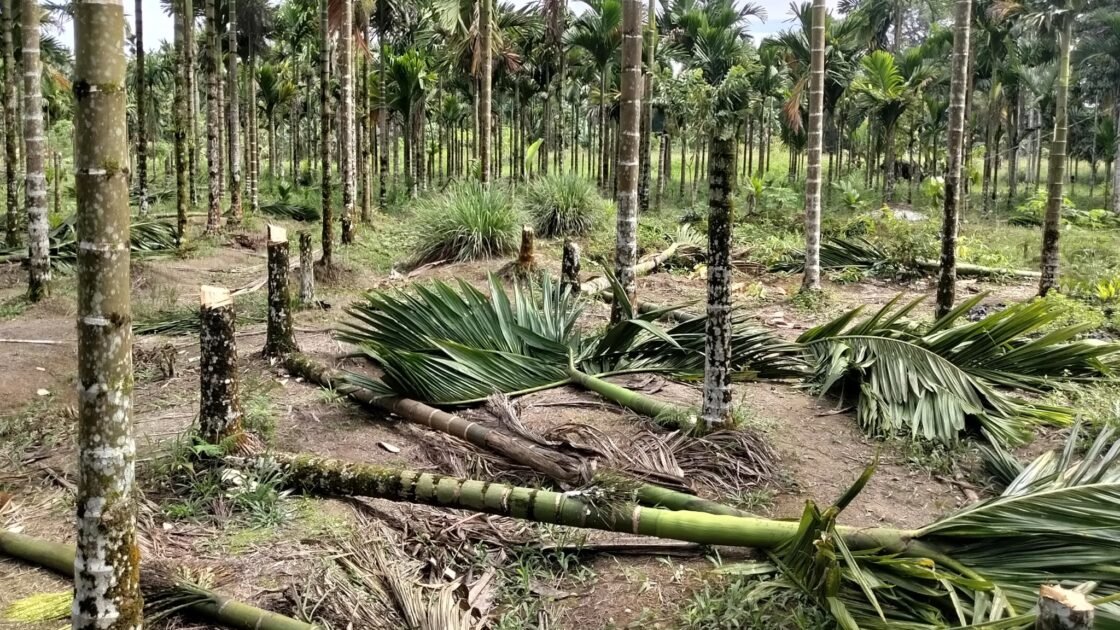 Hampir satu setengah hektar dari total tiga hektar kebun pinangnya yang telah ditanam dan rawat selama 10 tahun dipotong dan hancur.