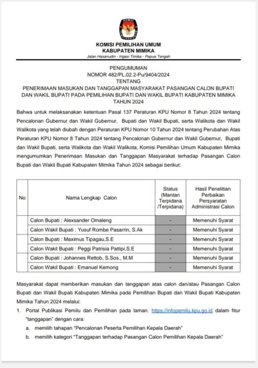 Hal ini berdasarkan keputusan KPU nomor 481/PL.02.2-PU/9404/2024 tentang hasil penelitian persyaratan administrasi calon dalam pemilihan bupati dan wakil bupati Kabupaten Mimika tahun 2024.