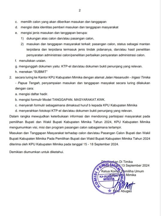 KPU Mimika juga telah mengeluarkan surat nomor 482/PL.02.2-Pu/9404/2024 Tentang Penerimaan Masukan dan Tanggapan Masyarakat Pasangan Calon Bupati dan Wakil Bupati Pada Pemilihan Bupati dan Wakil Bupati Kabupaten Mimika Tahun 2024.