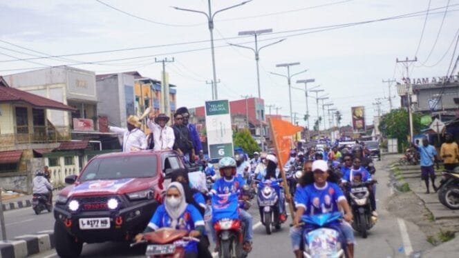 SASAGUPAPUA.COM, TIMIKA – Ribuan massa pendukung pasangan calon Bupati dan Wakil Bupati Kabupaten Mimika Alexander Omaleng-Yusuf Rombe (AIYE) melakukan konvoi keliling Timika, Kamis (21/11/2024).