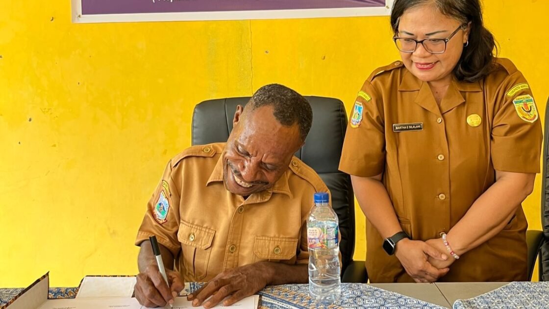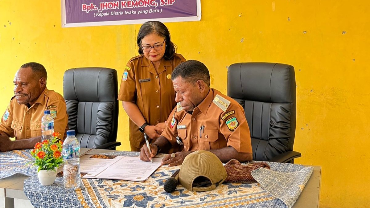 • PENGABDIAN DAN HARAPAN: Pejabat lama Linus Dolame dan pejabat baru Jhon Kemong saat menandatangani berita acara sertijab. Momen ini menandai peralihan tanggung jawab pemerintahan di wilayah Distrik Iwaka.
