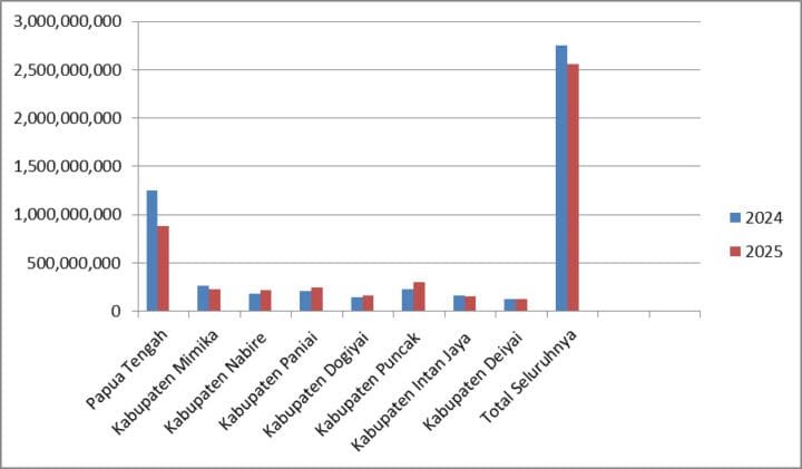 Untuk total tahun 2024 dana otsus seluruh Wilayah Provinsi Papua Tengah senilai Rp2.753.614.656, sementara jumlah keseluruhan untuk tahun 2025 sebelum efisiensi sebesar Rp2.555.608.215.
