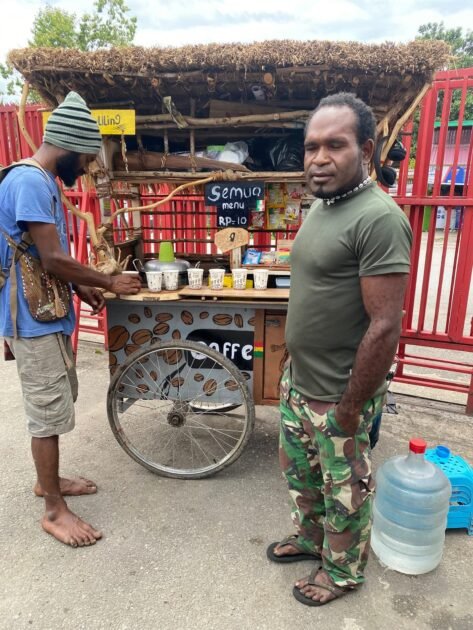 Gerobak itu kini tampil sangat estetik, menyatu dengan alam, dan dilengkapi kompor di dalamnya untuk menyajikan kopi Wamena asli maupun kopi saset bagi pelanggan setianya.