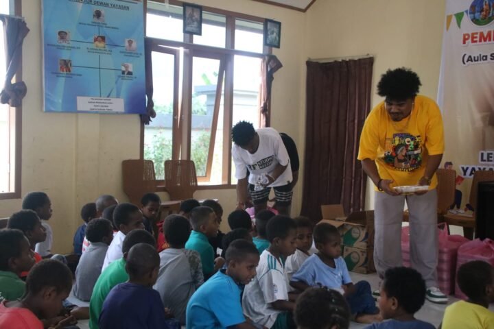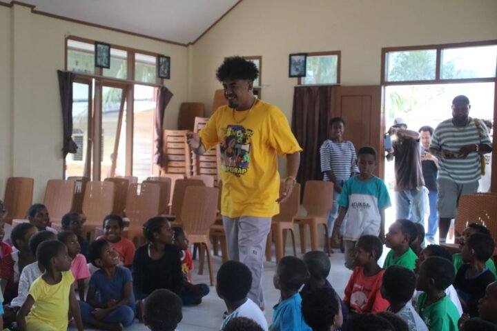 MUSISI Asli Papua Epo D’Fenomeno, Bariton Waramori (Omcon SB) dan Nanji Yoseph beserta rombongan mengunjungi Panti Asuhan Santa Susana yang terletak di Jalan Poros SP 2-SP 5, Kabupaten Mimika, Provinsi Papua Tengah, Jumat (19/7/2024).