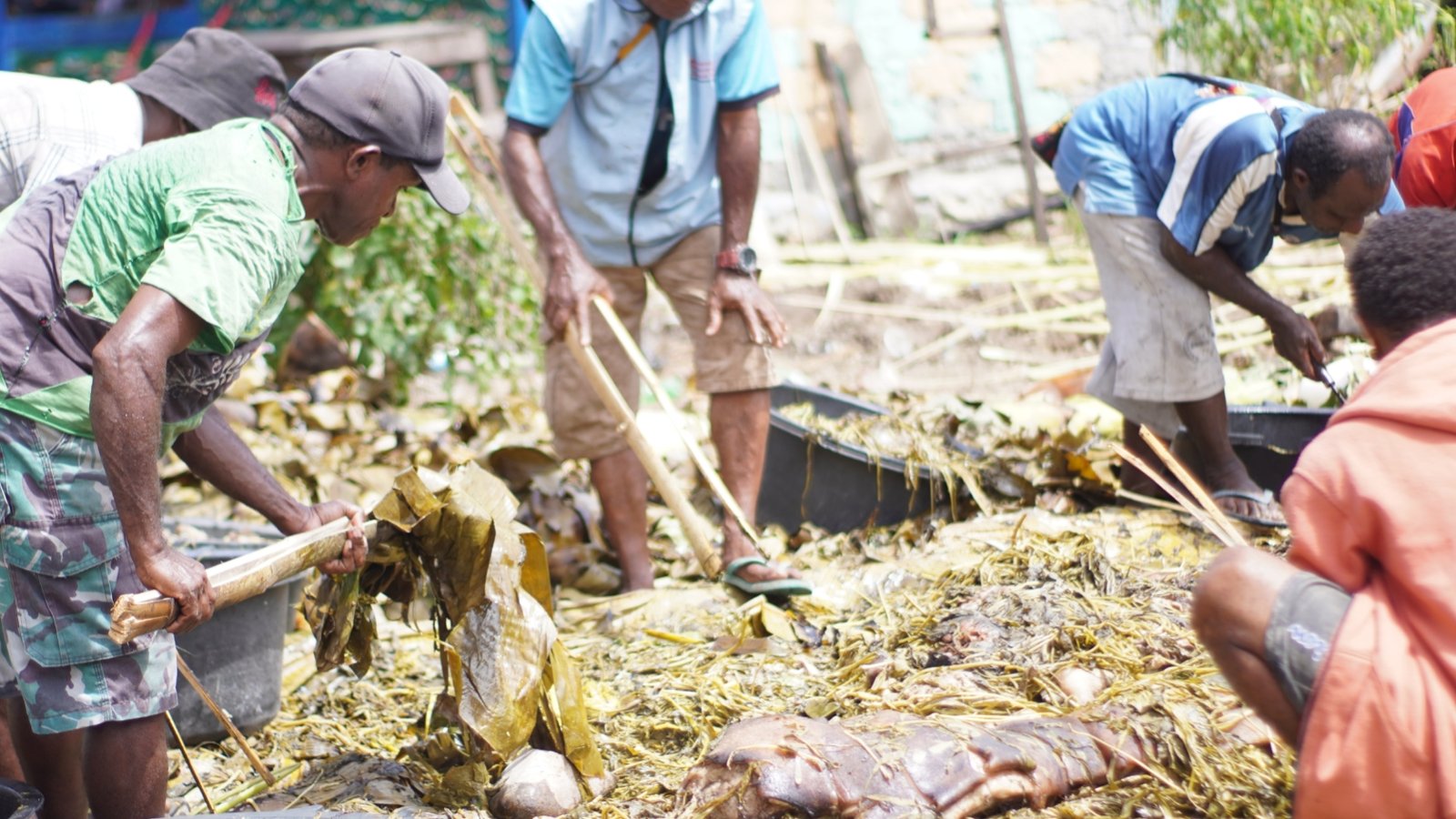 Lima ekor ekina yang telah dimasak dengan uap batu panas menjadi sajian utama, didampingi ayam, ubi-ubian, dan sayuran segar yang disiapkan bersama oleh para ibu, bapak, dan pemuda.