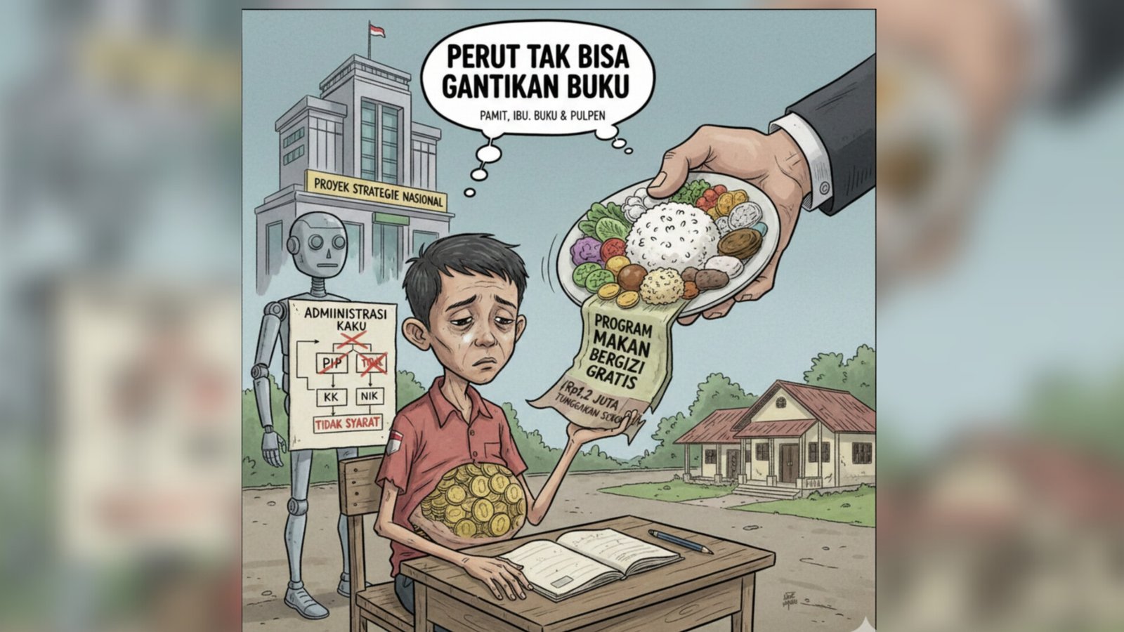 MBG adalah program yang mudah dihitung dan difoto. Jumlah porsi jelas. Dapur bisa diresmikan. Distribusi bisa dilaporkan. Ia cocok dengan logika proyek strategis nasional: cepat,. masif, dan terlihat. Sebaliknya, buku tulis, pena, dan pembebasan biaya sekolah adalah masalah sunyi. Ia tersembunyi di kelas-kelas pinggiran. Ia terjerat data, KK, NIK, dan domisili. Ia tidak fotogenik.