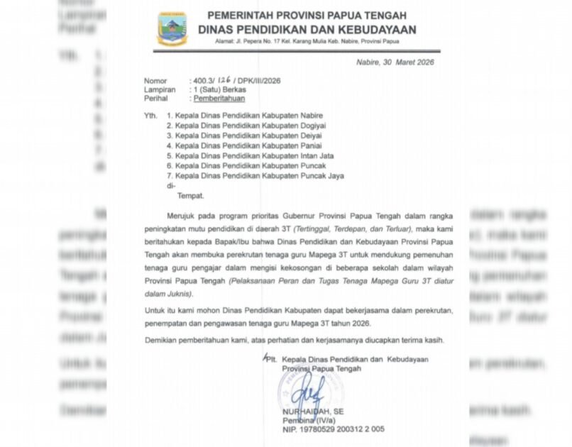 SASAGUPAPUA.COM, Papua Tengah – Pemerintah Provinsi Papua Tengah melalui Dinas Pendidikan dan Kebudayaan secara resmi mengumumkan pembukaan rekrutmen Tenaga Mapega Guru Kontrak untuk daerah 3T (Tertinggal, Terdepan, dan Terluar) tahun anggaran 2026.