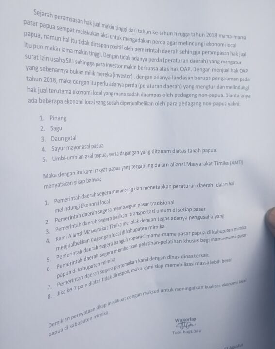 - Kami Aliansi Masyarakat Timika menolak dengan tegas adanya pengusaha yang menjualbelikan dagangan local di kabupaten Mimika.
