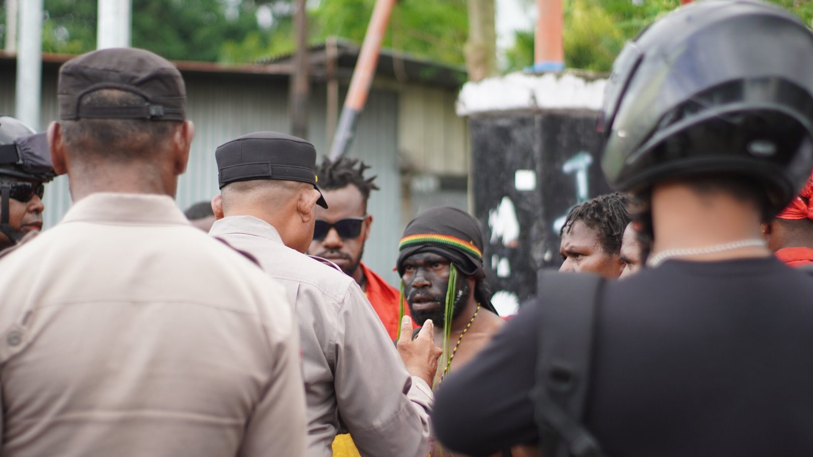 Seorang masa aksi saat berbicara dengan kepolisian. Senin (10/11/2025). Foto: Kristin Rejang/Sasagupapua.com