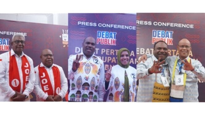 SASAGUPAPUA.COM, TIMIKA – Tiga Pasangan Calon (Paslon) Bupati dan Wakil Bupati Kabupaten Mimika yakni Johannes Rettob dan Emanuel Kemong (JOEL), Maximus Tipagau-Peggi Patricia Pattipi (MP3) dan Alexsander Omaleng (AIYE) memberikan memberikan apresiasi acara debat pertama yang diselenggarakan oleh kepada Komisi Pemilihan Umum (KPU) Kabupaten Mimika.